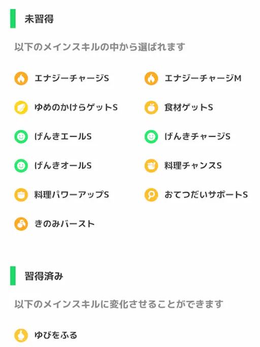 - メインスキル・食材・サブスキルの変更&食材・サブスキルの解放は「ひらめきのたね」をゲット・使用することで可能