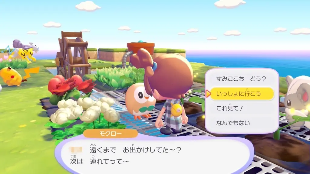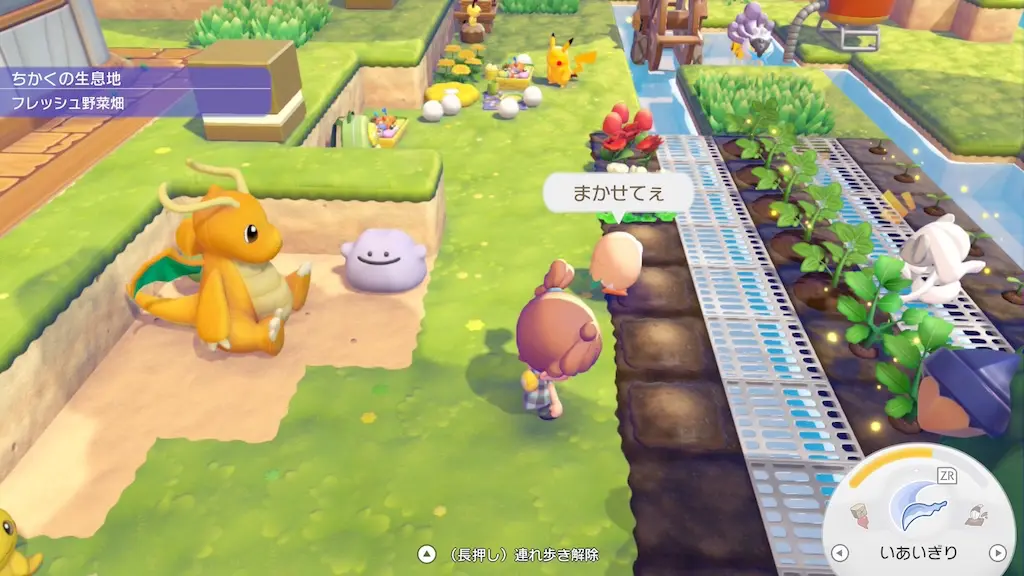 「さいばい」ポケモンに話しかけて「いっしょに行こう」を選択し植物の場所まで連れていきます。